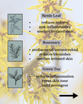 Ingredients: alcohol-free witch hazel infused with nettle, cleavers, green tea, calendula petals, licorice root, and rosemary